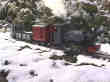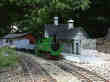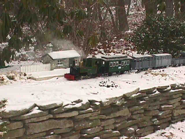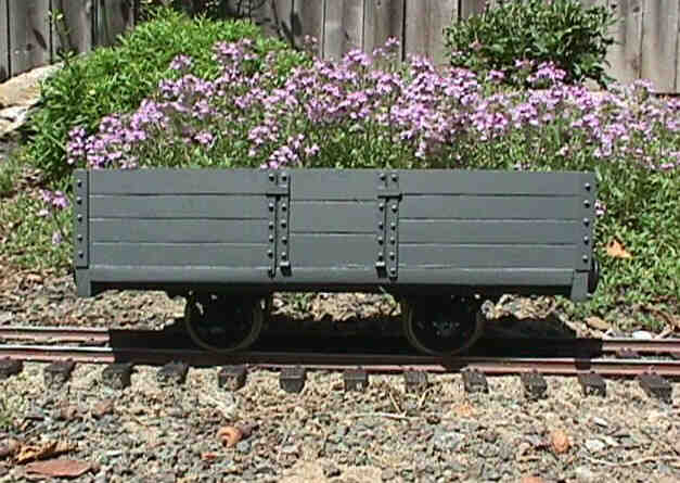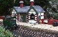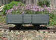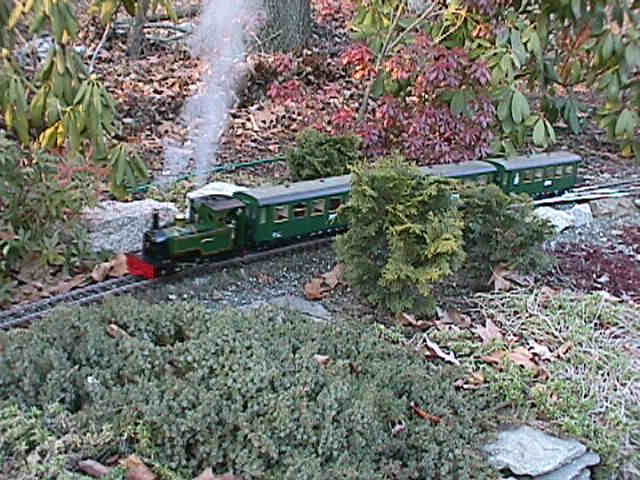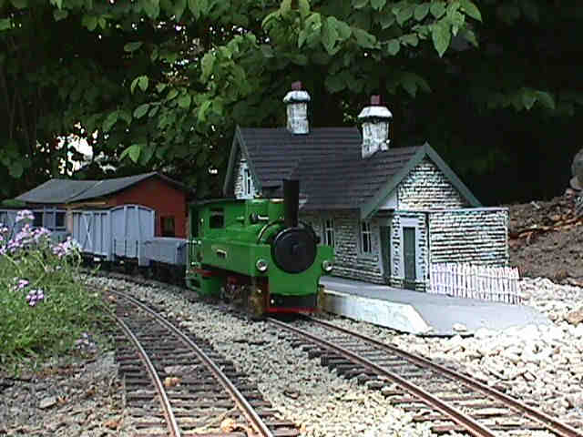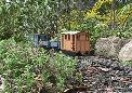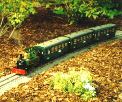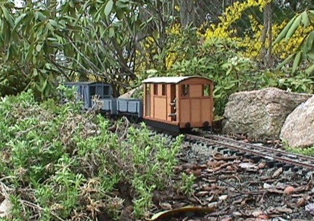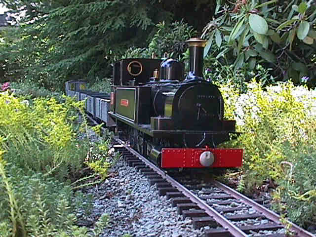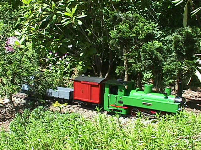 A battery powered tram from Perfect World on test on the Extension drifting down Black Hill towards Lahinch. Awaiting paint and nameplates, she's a powerful, smooth-running little critter. Here she's pulling a few opens built from Brandbright kits and a Welshpool & Llanfair brake van from Garden Railway Specialists. |