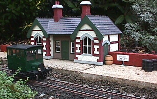 The Extension's newly-acquired inspection railcar making a surprise visit at Quilty. (This station has since disappeared, given that it was about two feet from where Moyasta Junction now sits). You can be sure the inspector was livid about the barrel blocking the emergency exit on the near side of the station house! The vehicle is a scale model of the railcar originally built by the T&D; inherited by CIE, it was used on all the narrow gauge lines, but it came to be based on the West Clare and was scrapped at Ennis after closure. |